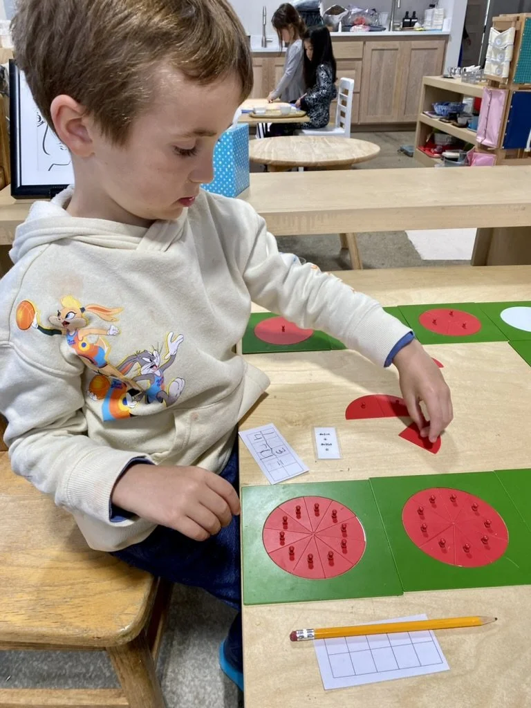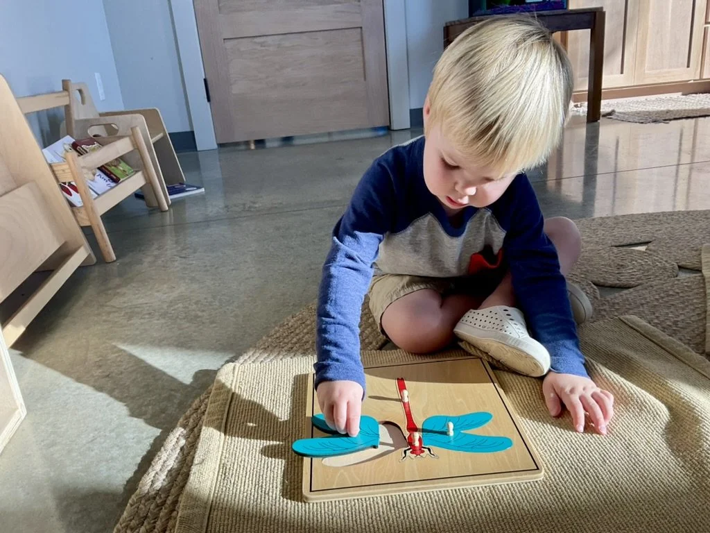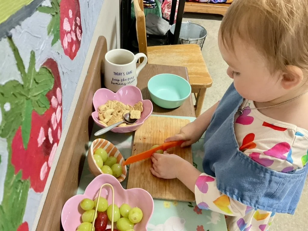 We strive to give each child self-led time, along with group lessons on work. The work is based on developmental stage learning and is well rounded in theme. We encourage practical life skills like hand washing, potty training, preparing snack, communal table for lunches, outdoor play and activities, art, science, and math skills.